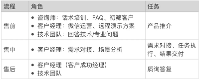 B端产品通常不是一个能一次性交付的产品,往往交付后,还需要进行客情维系,质询答复,增值空间挖掘,乃至续费等等。因此,可以根据阶段分为售前、售中、售后三个角色。在大型团队中,售后可能会有客户成功团队负责,而对于规模有限的创业团队而言,我们的客户经理需要同时负责售中和售后,并未设置客户成功经理的角色。这是基于服务周期、资源条件、行业特性(关系营销)等方面的考虑而定的。每家都有自己的服务特征和资源特征,根据产品和服务特征而定就好。