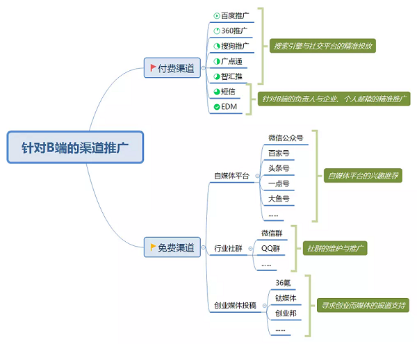 对于B端推广渠道的使用,与C端存在着比较明显的差异。首先,在渠道的选择上,B端更倾向于精准触发的渠道,很难也很少会出现大规模无差别的炒作与宣传。我们在进行上线前的渠道选择与推广的时候,一直都是坚持“精准触发”的原则,与此同时,辅之以其他常规的渠道进行品牌宣传。