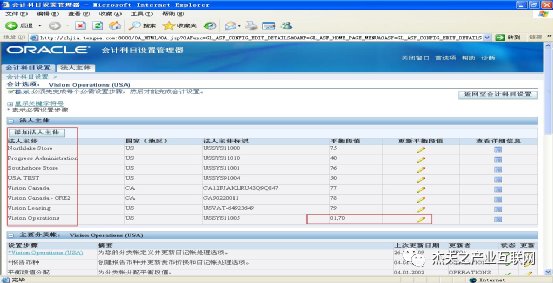 要注意的是,在R11中定义的LE时,并未作与“会计科目弹性域结构”的“公司段”值关联,用户必须对于其是与公司段值中的哪个值对应心中有数。而在R12中,LE的组织定义虽在FORM中仍然保留,但LE的“法人主体会计科目”的FORM设置被废弃(故FORM中定义了也无用),改为在定义“分类帐”时的“会计科目设置管理器”WEB中定义并分配法人实体LE。一个分类帐设置(主辅分类帐)可以添加多个LE,但每个LE只能具有一个分类帐设置。如下图25所示: