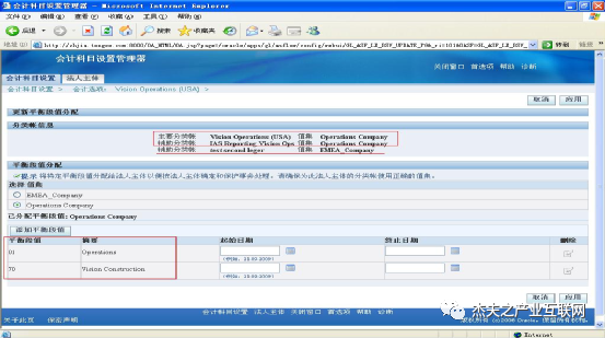 在R12中,还必须为法人实体分配会计科目弹性域结构的公司段即平衡段值。每个LE可以分配多个“平衡段”值,公司段值集中每个段值一旦被分配给某LE,则其它LE就不能再被分配。在R11或R12中创建一个LE后,应当及时到会计科目弹性域结构中添加需要对应的公司段值LOV(一个或多个),并重新进行弹性域的编译,否则系统可能会弹出错误报警信息。R12中一个LE对应多个公司平衡段值,代表有多个分公司,LE是它们的合并。主辅分类帐可拥有相同或不同的公司段值集,表示从不同的维度(如按地区、按产品等)去划分公司以方便考核。如图26所示为LE添加平衡段值: