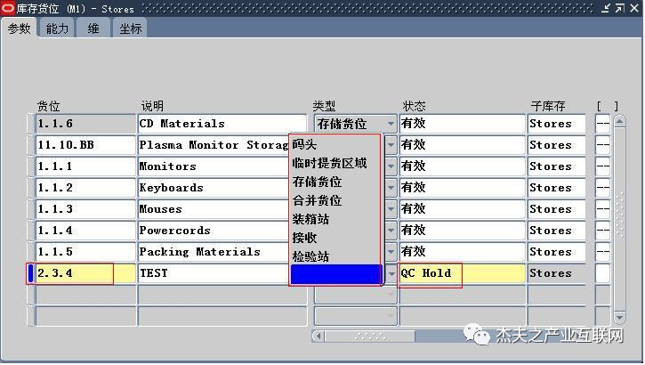 图 5‑22中,“货位”的输入由“货位弹性域”结构的定义决定,货位“类型”有“码头、临时提货区域、存储货位、合并货位、装箱站、接收、检验站、NULL”多个选项,分别对应于系统不同功能用途(取决于“子库存”的功能类型,例如不能将“接收”与“检验站”类型赋予“存储”类型的子库存)。一般使用取“存储货位”类型即可,NULL是为系统升级而设。“状态”字段默认自子库存题头相关字段,可以改写。如果子库存层启用了“货位别名”,这里也必须逐行输入。有关“能力、维、坐标”的Tab页内容,主要是为WMS的相关功能(尤其是与立体自动仓库系统连用)做准备,详细内容,这里不再赘述。