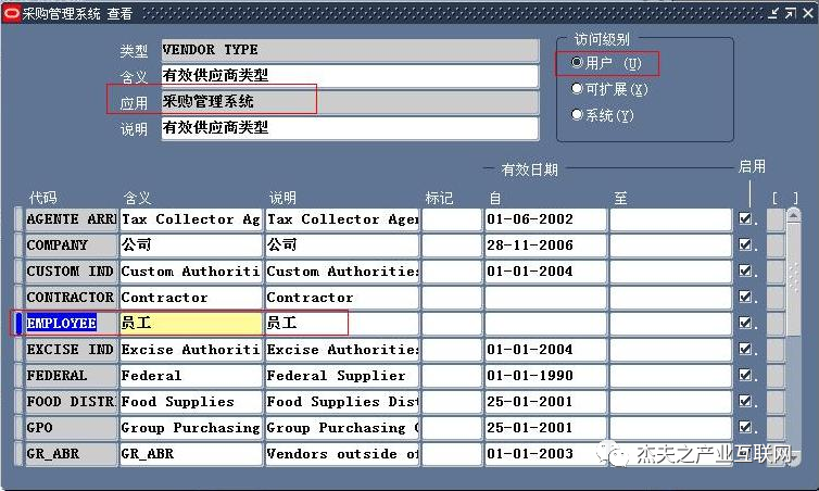 尽管上面依据各种属性对供应商做了种种分类的讨论,但实际上在EBS系统中,除“员工”类型之外,其余“供应商类型”实际只是主要起到统计分析的作用,于系统流程角度看并无本质区别。但要注意的是,尽管供应商类型Vendor Type 的访问级别是“用户”,即用户可以完全自定义,其LOV值不参与系统流程构建。但EBS初始安装所预置值中的代码“EMPLOYEE 员工”并不能被删除或修改,因为在定义供应商时,如果找不到“员工”类型,则就无法将员工设置为供应商,而一旦无法将员工设为供应商,则应付AP系统在处理员工费用报表时将无法进行。故Vendor Type的“访问级别”实际上应当是“可扩展”(这可能是系统Bug)。