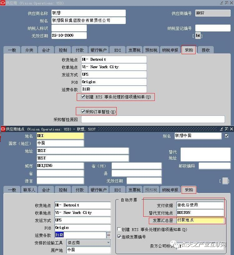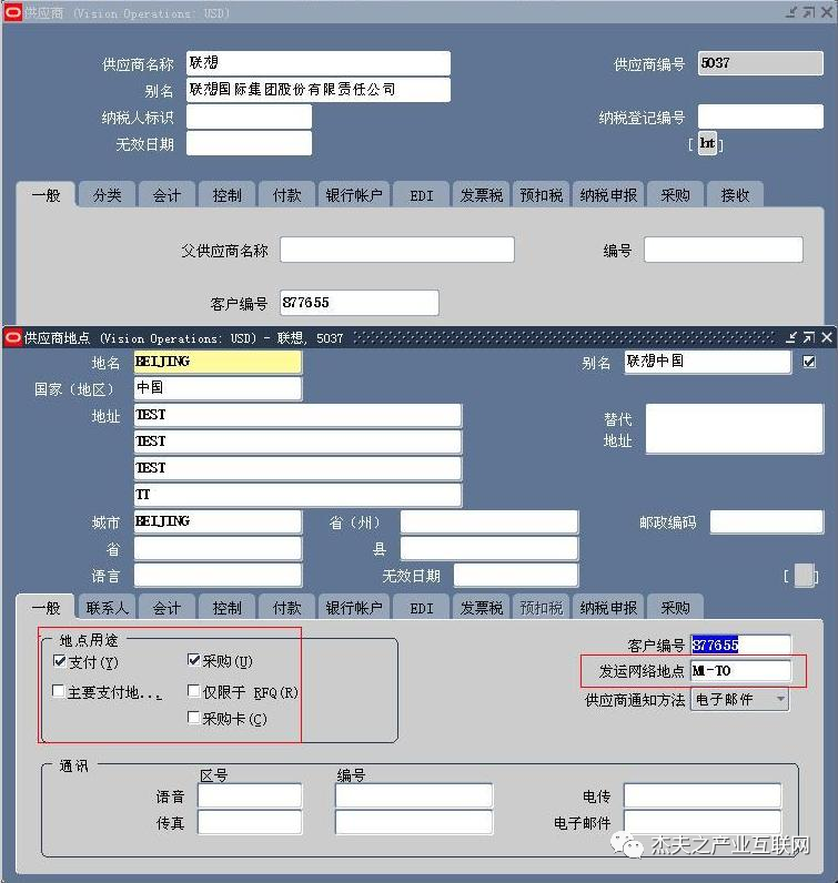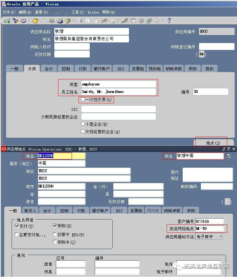 在EBS中,有关供应商的信息或属性被分为两个层次“供应商层”与“供应商地点层”,这两个层次的信息字段绝大部分有重复,少部分可能只在“供应商层”或“地点层”中才有。仅在“供应商层”有的信息如:“一般、分类、接收”Tab页中的相关内容,自动适用于“地点层”,为该供应商的不同Site所共有;在信息字段有重复的部分,“供应商层”的输入信息会被自动默认到Site层,但在Site层可更新维护,允许与供应商层内容不同。