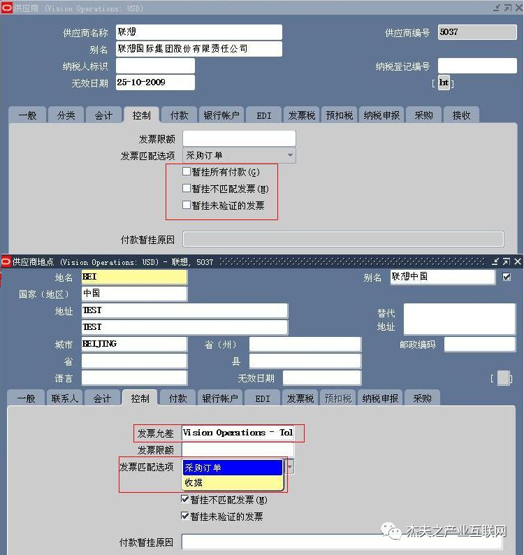 供应商层与供应商Site层的“控制”Tab页内容基本相同,仅在Site层多了“发票允差”字段。其中的“发票限额”设置,表示如果为该供应商地点输入的某张发票超过了指定的发票限额,则AP系统将在审批期间对该发票应用“金额”暂挂,在释放暂挂之前,将无法支付该发票。注意:“发票限额”的供应商层与Site层并无汇总关系,只是提供默认值。其LOV值是在AP系统专门设置的。“发票匹配选项”,有两个可选值:采购订单PO、收据Receipt。前者即为所谓“二重匹配”,后者即为所谓“三重匹配(接收Receive)或四重匹配(接受Accept)”(一般都是四重匹配,具体取决于企业管理规定)。如图 4‑58所示。