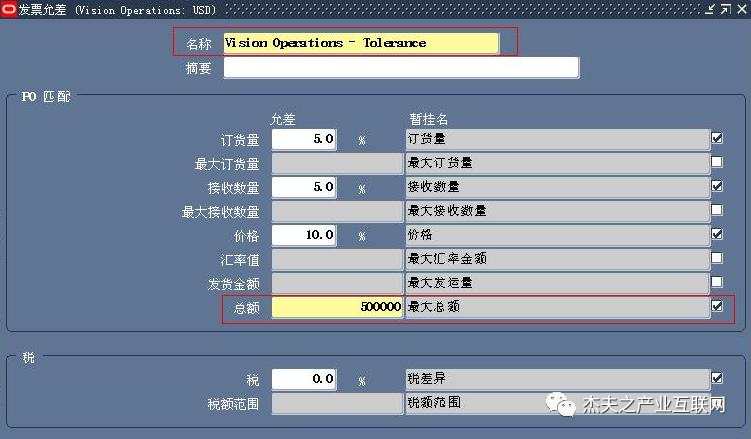 图 4‑58中,供应商层或Site层的“暂挂所有付款、暂挂不匹配发票、暂挂未验证发票”,顾名思义,作用于不同的发票范围。而Site层的“发票允差”的值默认于“AP系统选项”的设定值(可以改写),其LOV值是在AP系统中专门定义的。如图 4‑59所示。