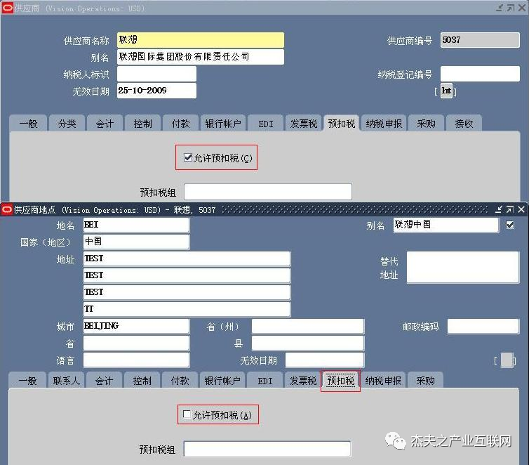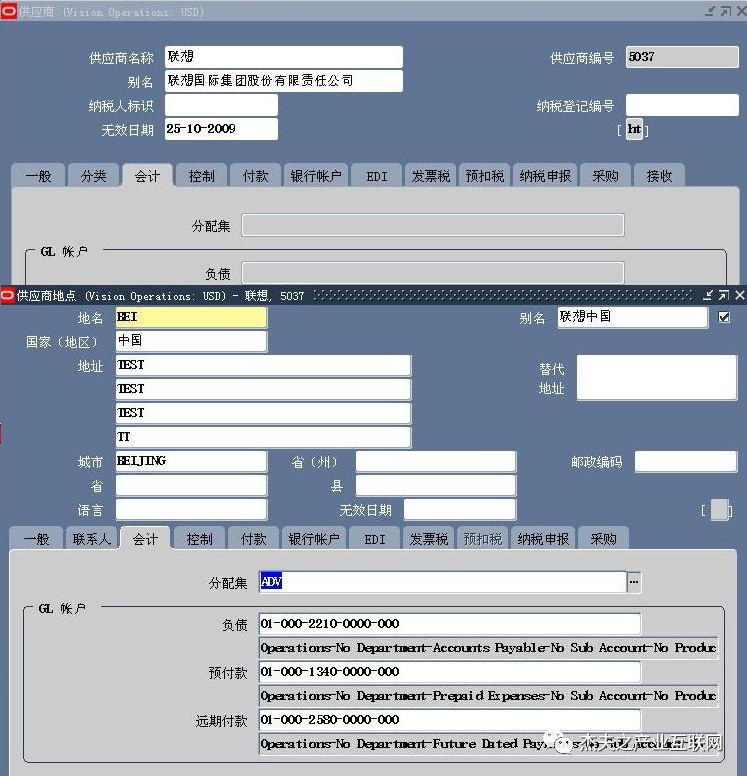 这里所说的多组织是指多OU而言,R11与R12都实现了供应商的多组织功能,即供应商可跨组织(OU)定义与维护。系统通过将供应商Site与OU进行绑定来实现这一点,即任一供应商Site必须属于某一确定的OU(不同OU但名称相同的Site,实际上是两个不同的Site)。在使用多组织支持功能的系统环境下,不能在供应商层输入以下字段:负债帐户、预付款帐户、分配集、发票税税码和远期付款(应付票据)帐户(字段灰显),而只能在供应商地点层输入这些字段。