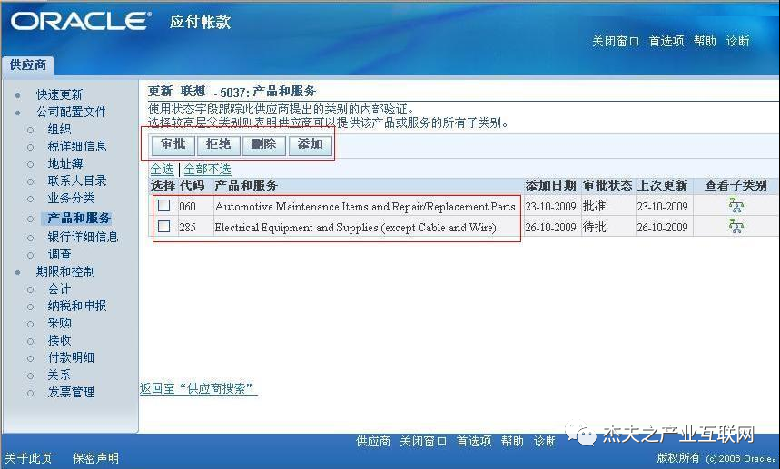 从大的内容范围角度来看,R12为供应商增加了三个新内容(或Tab“分组”页),包括:产品与服务、信息调查、相互关系。前两者主要应用于i-Supplier供应商门户产品中。在“产品与服务”Tab页中,以“类别Category”来表示供应商可以提供的产品与服务(由供应商在i-Supplier中维护),有关管理员可以“添加、删除、审批或拒绝”。如图 4‑65所示。