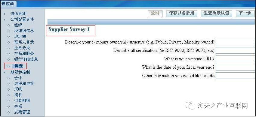 在信息“调查”Tab页中,可以创建“调查表”要求供应商填写反馈并复查有关内容,如图 4‑66所示。