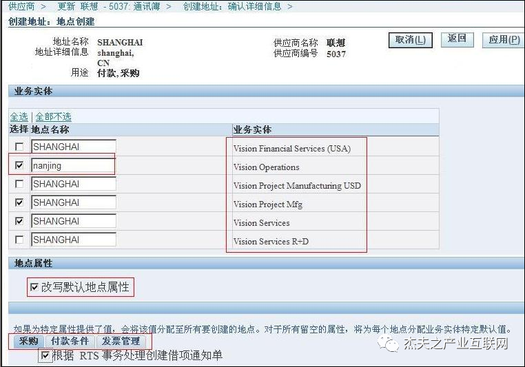 图 4‑72中的“改写默认地点属性”,提供了为所有供应商Site批量更改“采购、付款条件、发票管理”相关属性的便利工具(以后还可以逐个修改更新)。
