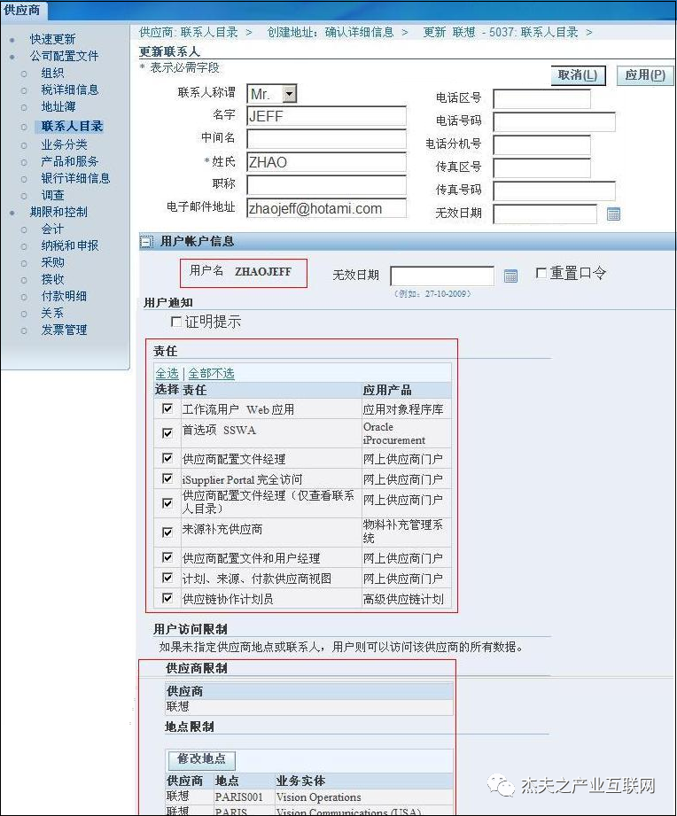 R12中的联系人定义与R11的不同之处在于,R12是先定义联系人然后分配给供应商Site及其关联的业务实体OU,同时还可以为供应商联系人分配用于供应链协作的相关应用模块的“责任”,如图 4‑73所示。