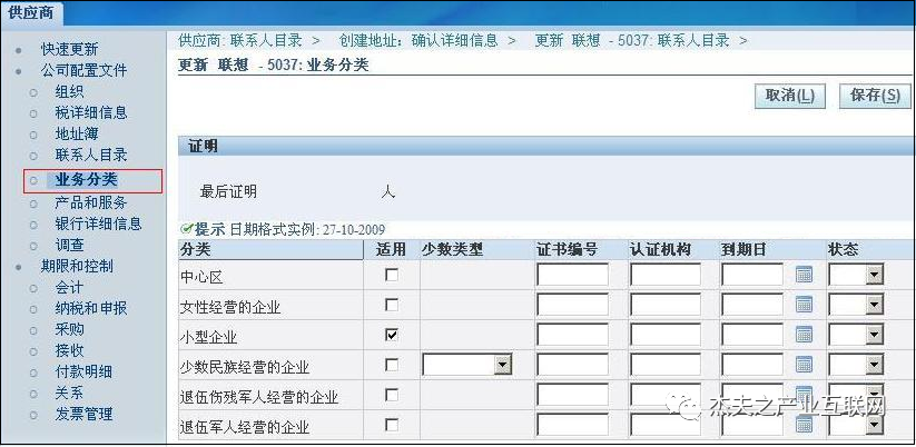 在供应商层的“分类”Tab页,除了前面供应商分类概述中讲到的“类型”(Type)字段的LOV可选值之外,系统还提供了一些其它的补充字段设置。如“少数民族经营的企业、女性经营的企业”等;其中,“一次性交易与小型企业”,只是一个标识,实际系统并不限制与其的交易次数与交易规模;SIC是Standard Industry Code 的缩写,只能手工输入,并无LOV值。不过,企业可以利用此SIC字段,输入自定义的符合企业某些特殊分类需要的代码,例如以不同代码区别“更可靠的供应商”和“不太可靠的供应商”,或者如“原始设备制造商”和“办公用品供应商”等等。上述字段均只有统计分析的功能,并不参与系统业务流程构建。