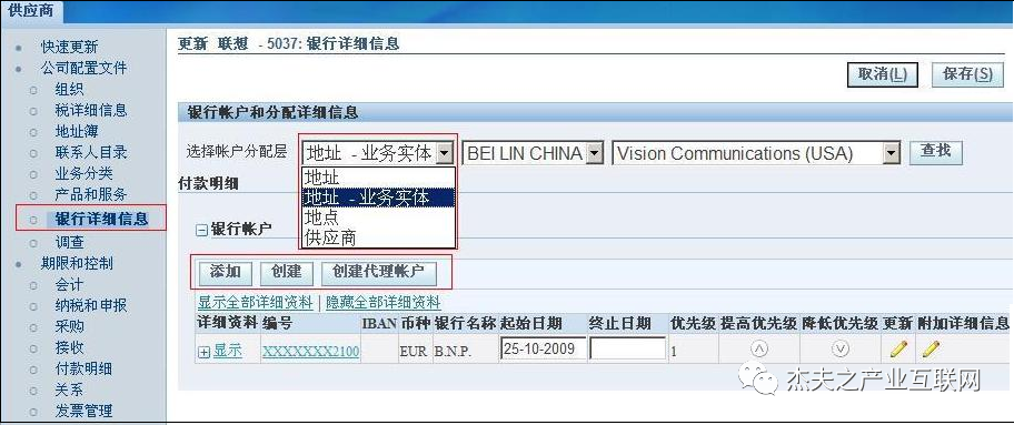 R12的银行账户信息维护方式与R11相比也有较大变化.R11只能引用已经定义好的银行账户信息,而R12只能在定义供应商时,直接为“供应商、地址—地点、地址—地点—业务实体、地点-业务实体”的不同分配层创建银行账户信息,并且上一分配层所创建的银行账户信息可以在下一分配层被“添加”给有关条目。如图 4‑75所示。