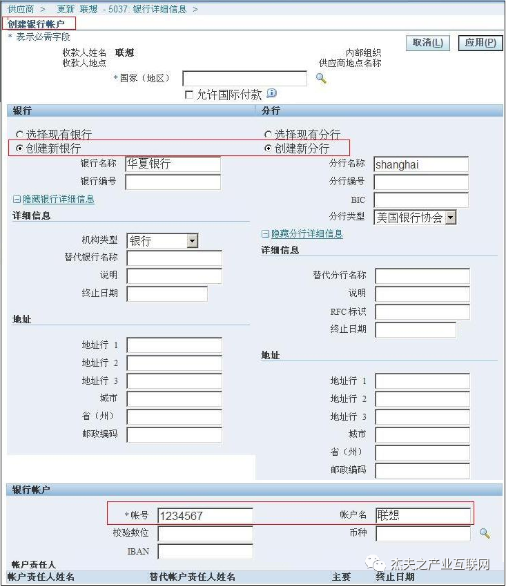 R12在创建供应商银行账户信息的同时,还可以同时创建有关银行信息,如图 4‑76所示。有关R12银行信息及银行账户信息的创建,请参考本书(下部)最后章节“EBS R12全新系统设置及业务测试实例”的有关内容。