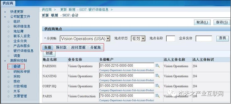 R12的供应商“会计”信息内容与R11相同,但是在同一个界面列出了所有“Site—OU”组合的设置值,因而比较方便查看。如图 4‑77所示。