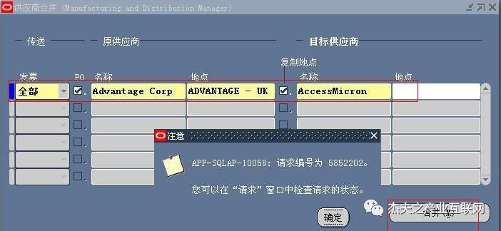 如果选定“复制地点”,则会为目标供应商自动创建原Site。如果选定“PO”,则系统将使用目标供应商信息更新所有相关的采购订单信息。包括:接收事务处理、报价单请求、供应商计划、来源补充信息、批准的供应商列表和 MRP 信息等等。作为合并程序的一部分,AP系统会使从中合并所有事务处理的原供应商地点无效。如果选择合并所有地点的所有事务处理,则AP系统还将自动使供应商无效。“供应商合并”不会删除原供应商数据实体(最多使之失效)。