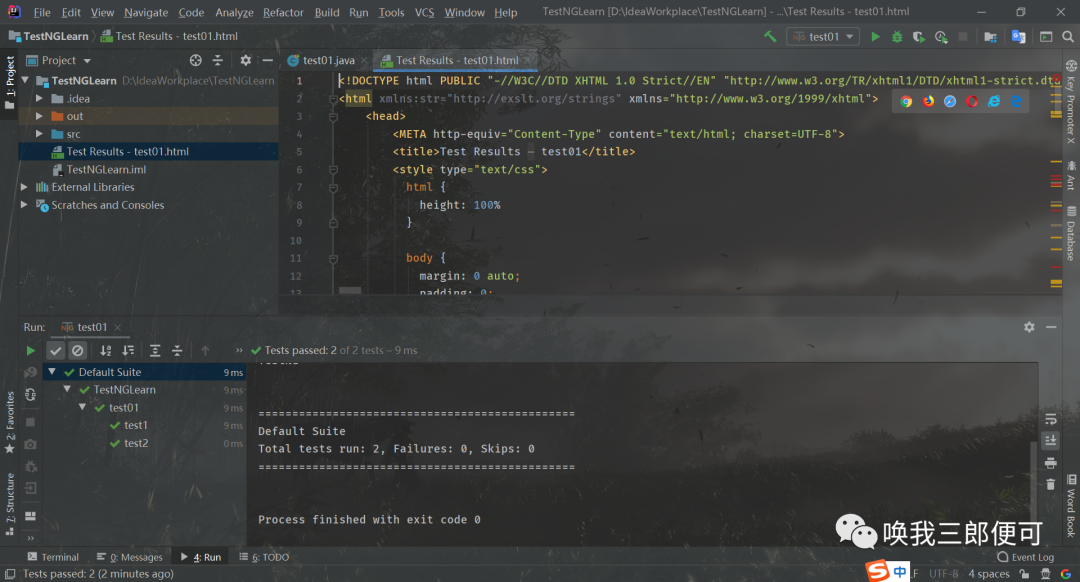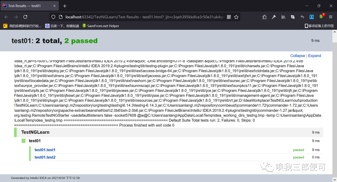 绿色的状态条,表示测试通过,失败应该是红色 显示执行了多少条用例,失败多少,跳过了多少,耗时多少 可以看到默认的Suite和执行测试类的名称。 导出TestNG测试报告 可以看到是调用哪个TestNG.xml文件去执行用例的