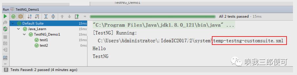package com.java.learn;import org.testng.annotations.Test;/*** create by Anthony on 2017/10/24*/public class TestNG_Demo1 {@Testpublic void test1(){System.out.println("Hello");}@Testpublic void test2(){System.out.println("TestNG");}}
