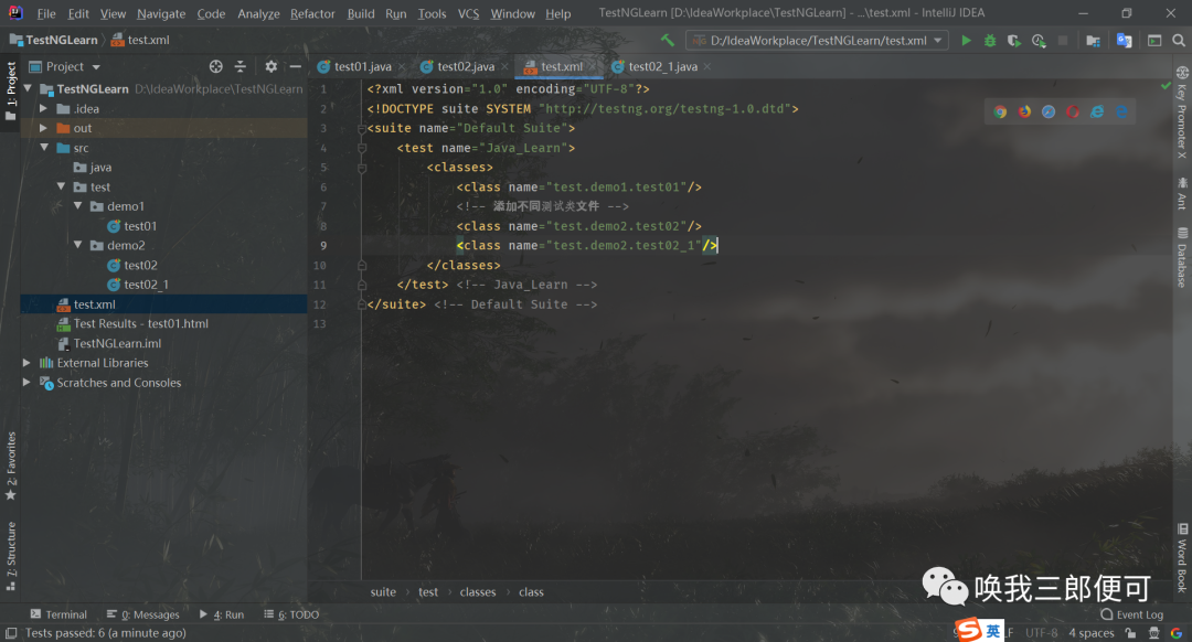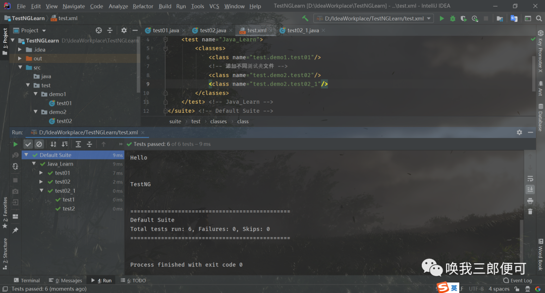 看这个之前,你得需要知道在xml语言中,注释语句写是这样写的“<!-- Java_Learn -->。我们可以看出来,suite管理多个test,而test管理多个class,最小单元是一个class文件。我们下面就来测试下第一个特点,同一个包下的不同测试类和不同包下测试类,如何正确写到testng.xml去运行。