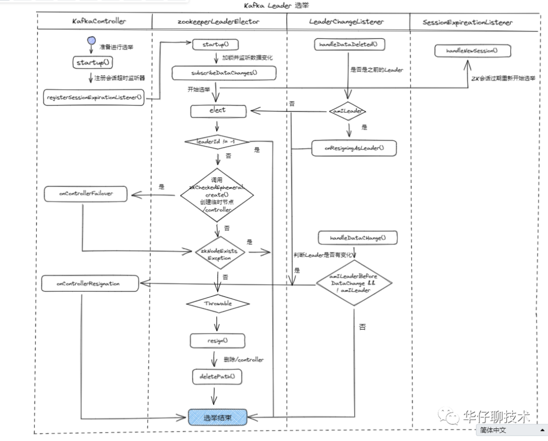 说完控制器方面的知识, 我们来讲解Leader节点的选举过程, 选举控制器的核心思路是:各个节点公平竞争抢占 Zookeeper 系统中创建 controller临时节点,最先创建成功的节点会成为控制器,并拥有选举主题分区Leader节点的功能。选举流程如下图所示:
