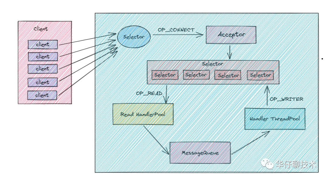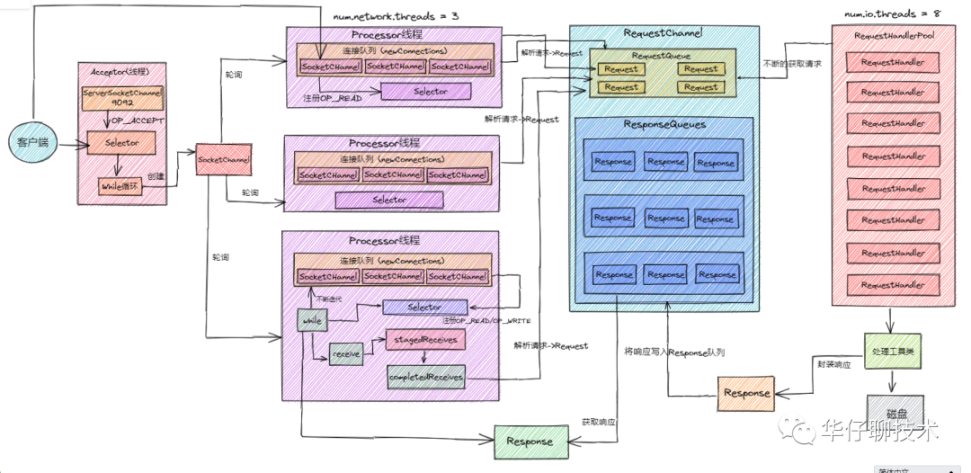 2) 在第一层架构中有3个一模一样的Processor线程, 这个线程的里面都有一个连接队列,里面存放socketchannel, 存放规则为轮询存放, 随着请求的不断增加, 连接队列里面就会有很多个socketchannel, 这个时候socketchannel就会在每个selector上面注册OP_READ事件, 参考上图第一层的第三个Processor线程, 即每个线程里面还有一个while循环会遍历每个socketchannel, 监听到事件后就会接收到客户端发送过来的请求, 这个时候Processor线程会对请求进行解析(发送过来的请求是二进制的, 上面已经说过, 跨网络传输需要进行序列化) , 并解析封装成Request对象发送到上图所示的网络第二层架构中。