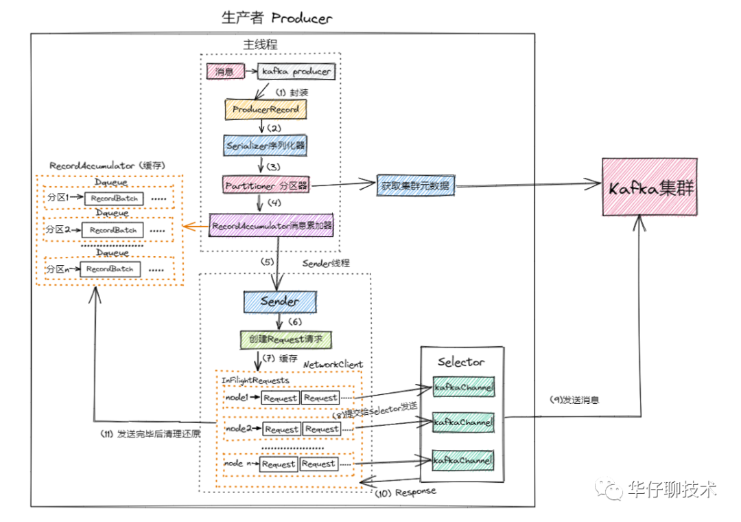1) 这里简化下流程, 来一条消息会先进行封装然后序列化最后会计算出分区号, 并把这个消息存储到缓存里面