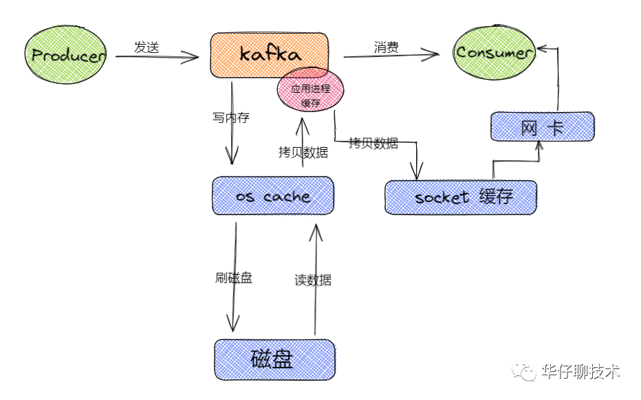 2) 接着从 os cache 里面 copy 数据到应用程序进程的缓存里面, 在从应用程序进程的缓存里 copy 数据到操作系统层面的 socket缓存里面, 最后再从 socket 缓存里面读取数据后发送到网卡, 最后从网卡发送到下游的消费者。