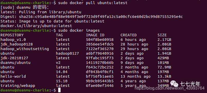,我这里已经拉取过了,如果第一次 pull 会开始下载。下载后可以看一下docker images