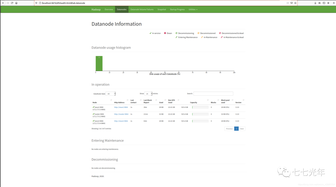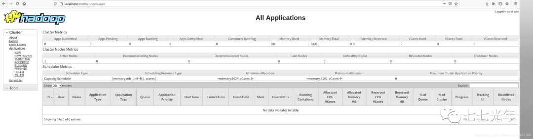 此时可以访问 localhost:9870 和 localhost:8088 ,去监控集群运行状态了,如下图