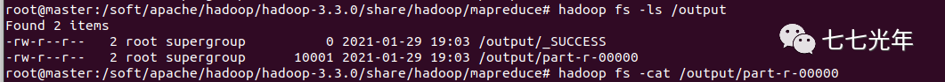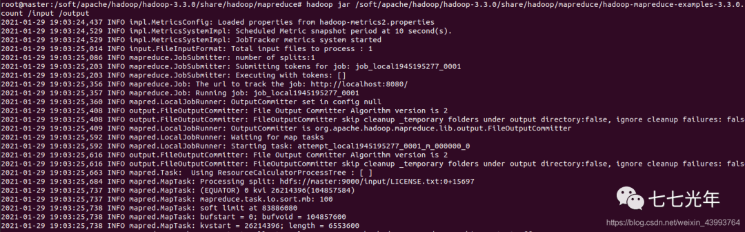 hadoop jar /soft/apache/hadoop/hadoop-3.3.0/share/hadoop/mapreduce/hadoop-mapreduce-examples-3.3.0.jar wordcount /input /output
