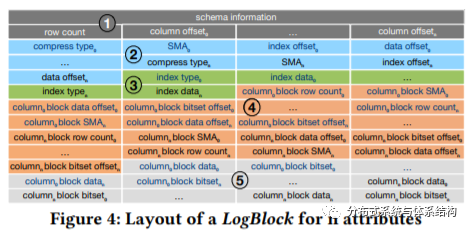 · 之后,data builder将行存转换成列存LogBlock,LogBlock类似于Lucene,为所有的列创建反向索引,LogBlock的结构如下图所示。该在此过程中,根据租户将行存表划分给不同的租户,controller会更新租户的相关元数据信息。