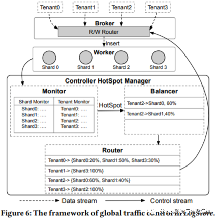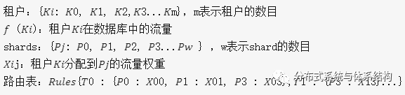如上述提到的,由于负载倾斜性以及ECS节点的异构性(性能不一致)等,会导致租户之间的负载不均衡,因而如何实现动态的负载均衡对提升系统的性能以及资源的利用率十分关键。为解决上述问题,LogStore提出了全局流量控制算法在router table中指定相应的规则,以解决负载均衡问题。Server Load Balancer将租户的请求分配给broker,controller将router table push到broker上,broker根据路由规则将请求分配到相应的shard,规则的格式如下所示: