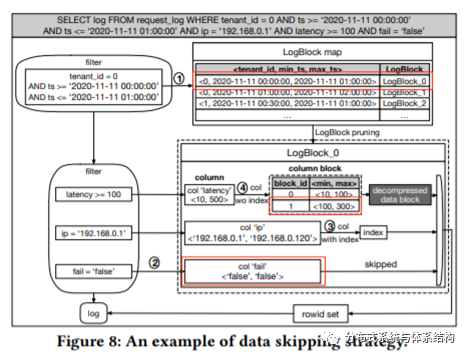 · Data Skipping:根据LogBlock的small materialized aggregates(SMA),即该物化结构里面的最大最小值,过滤掉不相关的内容。