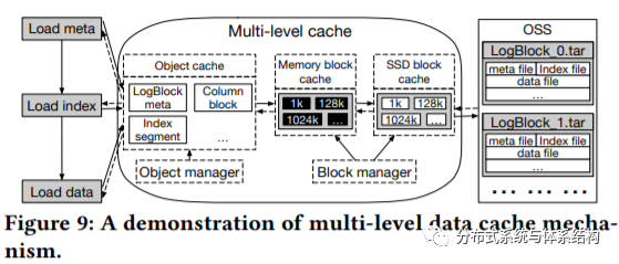 · multi-level data cache :通过缓存与预测策略,降低访问延迟,具体设计如下图所示。为了小文件管理引起的复杂度,LogStore将小文件打包成tar文件。同时为避免读取到不相关的数据,Logstore允许对其中的每个小文件进行单独的访问。从下图可以看出,LogStore中使用了多级缓存,当从OSS中读取数据时,首先会将数据存储到Memory block cache,当Memory block cache满时,将其替换到SSD block cace中,block manager负责管理两者之间的交互。另外,LogStore中也维护了object memory cache,主要目的在于减少频繁的对象分配。为提高查找性能,本文也设计了并行预取策略。