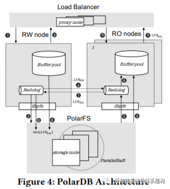 如图3所示,PolarDB Serverless维护了一个远程内存池,并通过RDMA进行访问。和PolarDB一样(图4),在PolarDBServerless中,仍然只有一个RW节点以及多个RO节点,并通过PolarFS访问存储池。