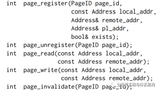 Page根据page_id进行识别,并通过page_register 和page_unregister管理page。page_register表示申请该page,引用加1,page_unregister表示释放,引用减1,当count为0时,表示该page被删除;page_read将page从内存池中读到本地内存中;page_write将page从本地内存中写到内存池中,以上过程都是通过one-sided RDMA 执行。.page_invalidate将所有RO节点中的本地内存的该page置为无效。