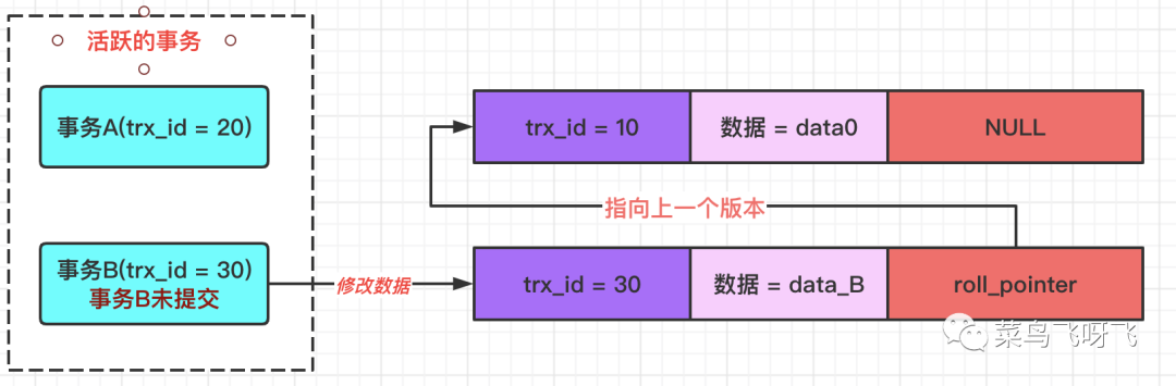 现在事务 B 去修改数据,将事务修改为 data_B,然后不提交事务。虽然不提交事务,但是仍然会记录一条 undo log,因此这条数据的 undo log 的版本链就有两条记录了,新的这条 undo log 的 roll_pointer 指针会指向前一条 undo log,示意图如下。