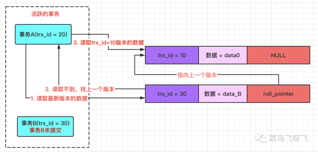 还是接着上面的例子说明。由于事务 B 将数据修改为 data_B 后,未提交事务,因此事务 A 在第一次查询时,不能读取到 data_B,只能读取到 data0。
