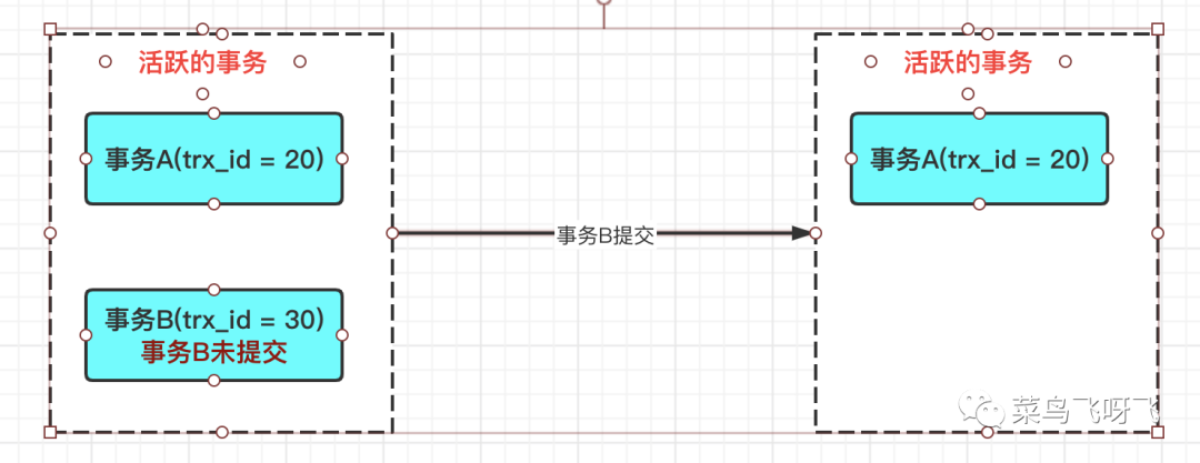 假设现在有事务 A 和事务 B 并发执行,事务 A 的事务 id 为 20,事务 B 的事务 id 为 30。