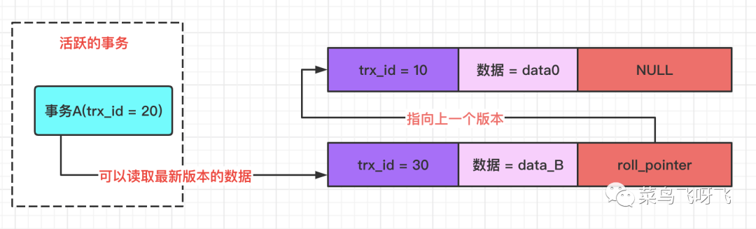 那么在 undo log 版本链中,数据最新版本的事务 id 为 30,「这个值处于事务 A 的 ReadView 里 min_trx_id 和 max_trx_id 之间」,并且在 m_ids 数组中包含有 30,这表示这个版本的数据是和自己同一时刻启动的事务修改的,因此这个版本的数据,数据 A 读取不到。所以需要沿着 undo log 的版本链向前找,接着会找到该行数据的上一个版本,也就是 trx_id=10 的版本,由于这个版本的数据的 trx_id=10,小于 min_trx_id 的值,因此事务 A 能读取到该版本的值,即事务 A 读取到的值是 data0。