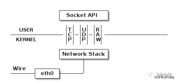 网卡接口 eth0所代表的真实网卡通过网线(wire)和外部网络相连,该物理网卡收到的数据包会经由接口 eth0 传递给内核的网络协议栈(Network Stack)。然后协议栈对这些数据包进行进一步的处理(如丢弃/转发/通知)。
