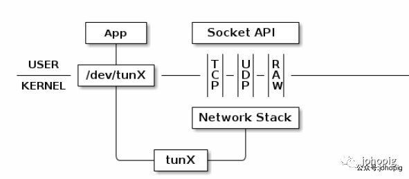 所有物理网卡收到的包会交给内核的 Network Stack 处理,然后通过 Socket API 通知给用户程序。下面看看 TUN 的工作方式: