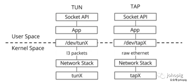 之类的命令给该设备设定 IP 地址。TAP 设备是一个二层设备,它比 TUN 更加深入,通过 /dev/tapX 文件可以收发 MAC 层数据包,即数据链路层,拥有 MAC 层功能,可以与物理网卡做 bridge,支持 MAC 层广播。同样的,我们也可以通过 ifconfig