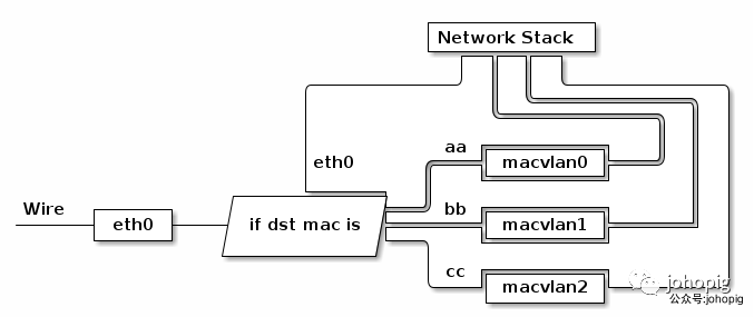 有时我们可能需要一块物理网卡绑定多个 IP 以及多个 MAC 地址,虽然绑定多个 IP 很容易,但是这些 IP 会共享物理网卡的 MAC 地址,可能无法满足我们的设计需求,所以有了 MACVLAN 设备,其工作方式如下:
