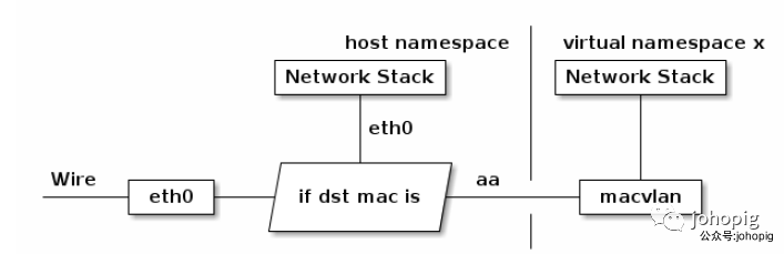 MACVLAN设备是从网卡上虚拟出来的一块新网卡,它和主网卡分别有不同的MAC地址,可以配置独立的IP地址。MACVLAN 会根据收到包的目的 MAC 地址判断这个包需要交给哪个虚拟网卡。单独使用 MACVLAN 好像毫无意义,但是配合之前介绍的 network namespace 使用,我们可以构建这样的网络: