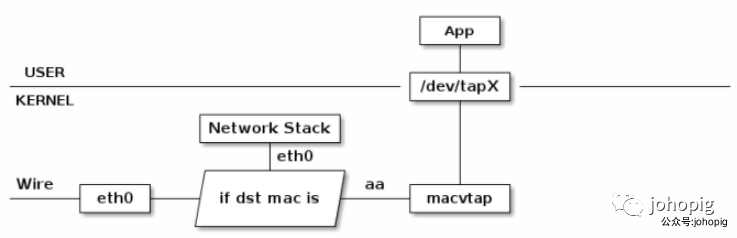MACVTAP 是对 MACVLAN的改进,把 MACVLAN 与 TAP 设备的特点综合一下,使用 MACVLAN 的方式收发数据包,但是收到的包不交给 network stack 处理,而是生成一个 dev/tapX 文件,交给这个文件: