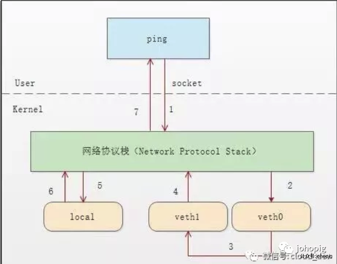 ,通过 socket 发给协议栈。由于 ping 指定了走 veth0 口,如果是第一次,则需要发 ARP 请求,否则协议栈直接将数据包交给 veth0。 由于 veth0 连着 veth1,所以 ICMP request 直接发给 veth1。 veth1 收到请求后,交给另一端的协议栈。 协议栈看本地有 10.1.1.3 这个 IP,于是构造 ICMP reply 包,查看路由表,发现回给 10.1.1.0 网段的数据包应该走 localback 口,于是将 reply 包交给 lo 口(会优先查看路由表的 0 号表, ip route show table 0