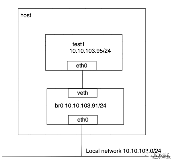 配置完的Docker容器和主机连接的网络拓扑如下: