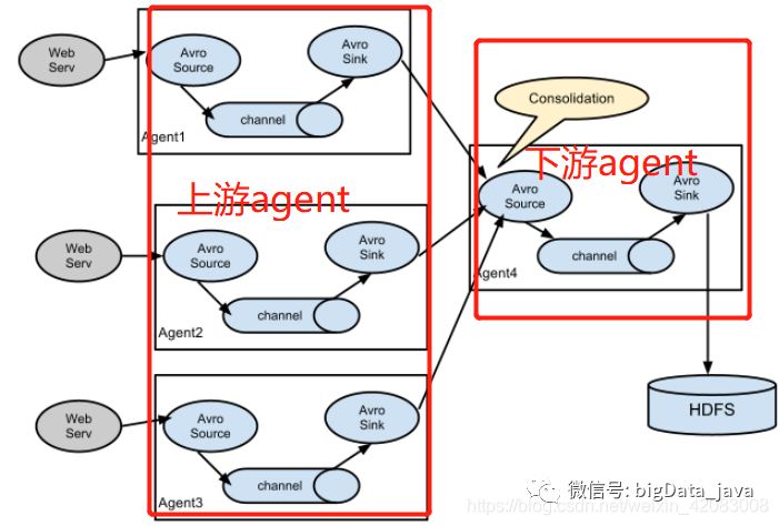 3)上游的agent的sink端口号为下游agent的source的端口号;上游agent的sink的type和下游的source的type都为avro,这是一种跨平台、跨语言的序列化方式