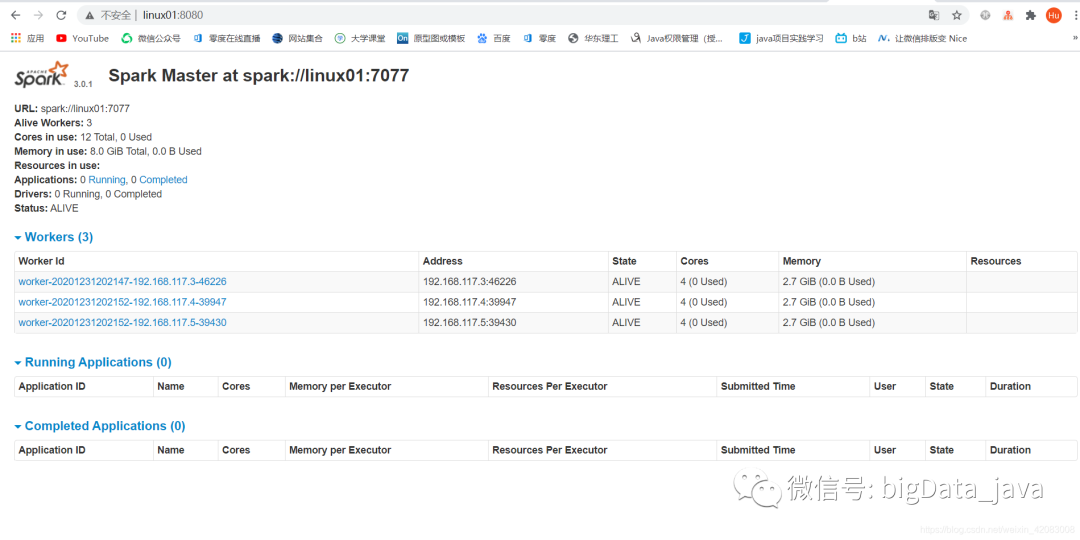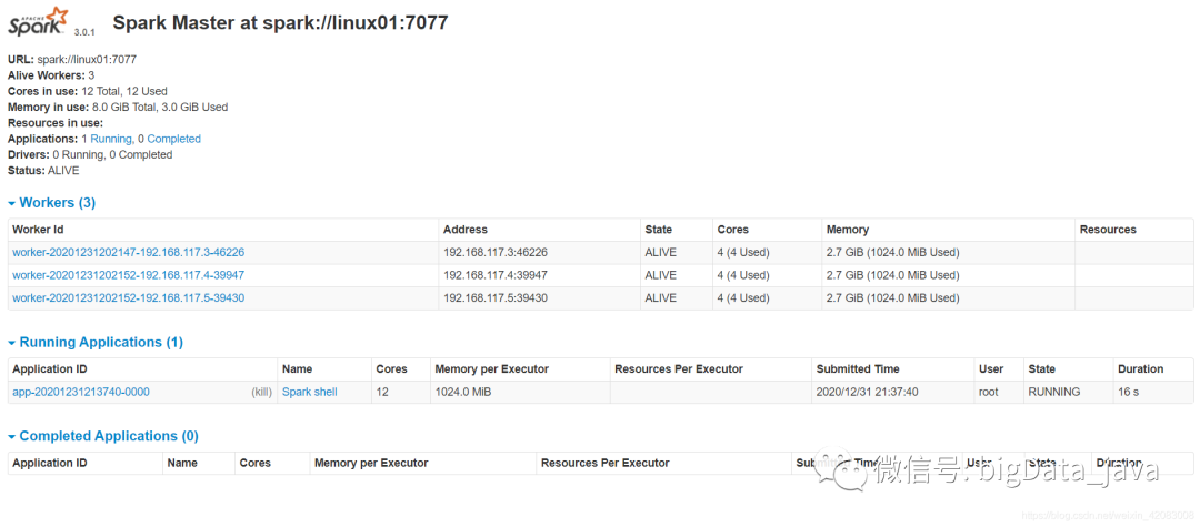 可以看到master所管worker共有三个,它们可以分配的内存及核数(这两个可以在spark目录下的conf 中设置内存和核数)此时正在运行的Application为0个,接下来我们启动spark-shell进行编程初体验