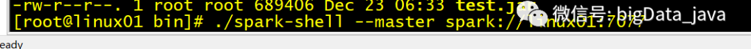 在bin目录下./spark-shell --master 是指定master所在的机器位置 后面可以再跟上 --executor-memory xxxm --total-executor-cores x 指定每个executor可分配内存多少m,可分配核数多少个,这里我没有指定,所以是默认 如果--master也不指定,则启动模式为本地模式 指定master,为集群提交模式